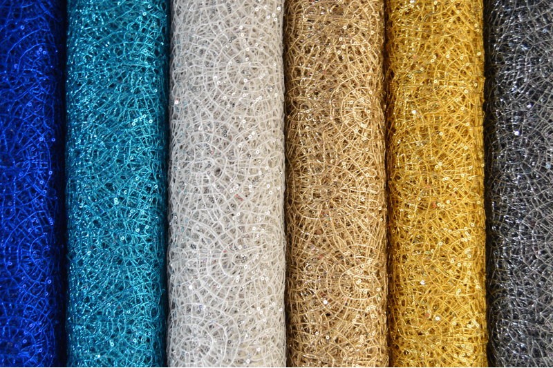 - Flot grovmasket netstof dekoreret med påsyede pailletter. Pailletterne har en diameter på 2-3 mm.
