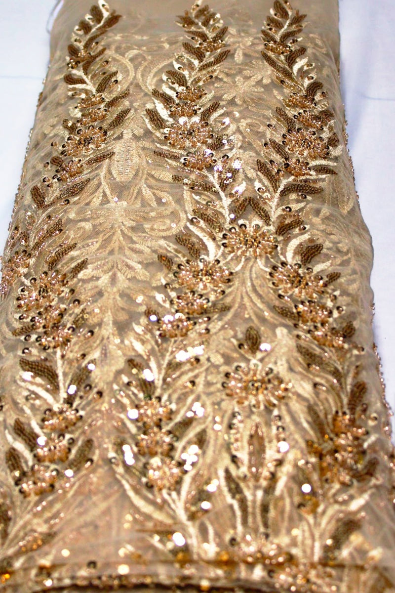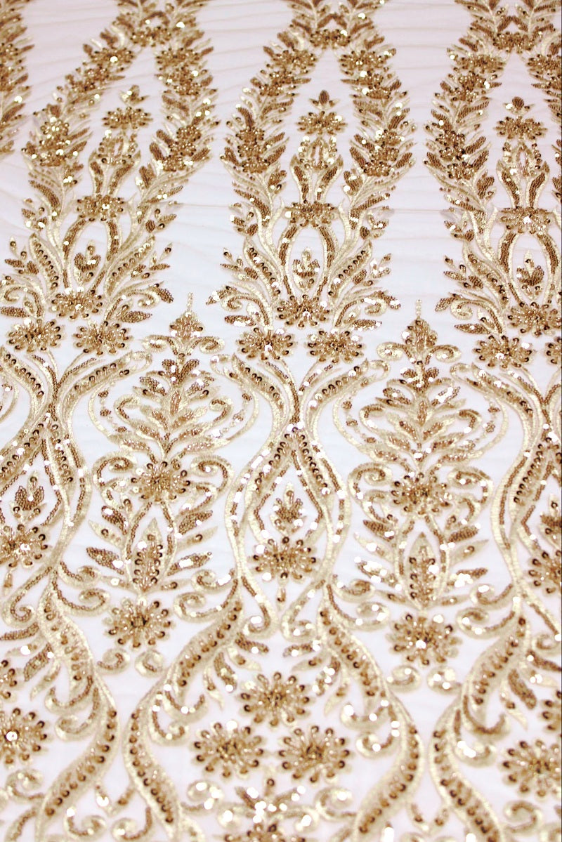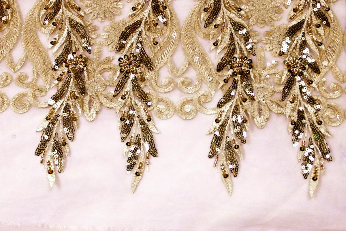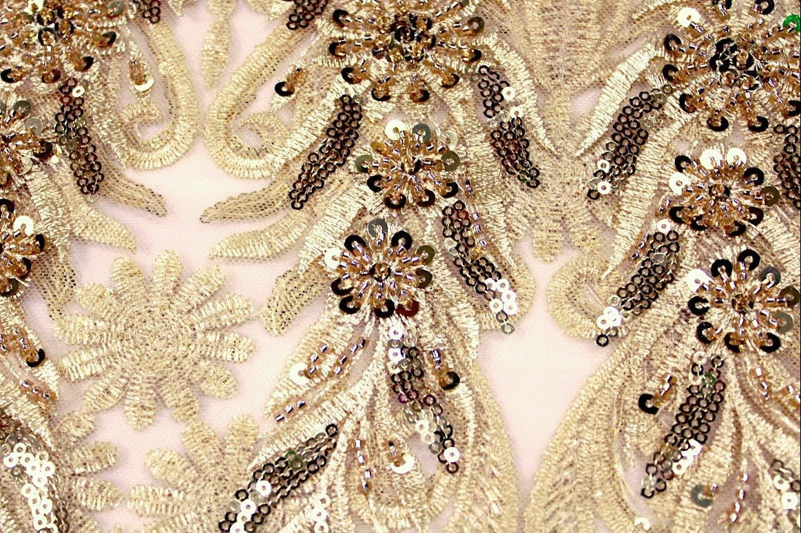 Der er brugt to slags runde pailletter med diameter på hhv. ca. 2mm og 4 mm. Derudover er der brugt små rørformede perler. Pailletter og perler er påsyet i mønster med blomstermotiver. Stoffets fulde bredde er 150 cm, og mønsterets bredde er 128 cm.