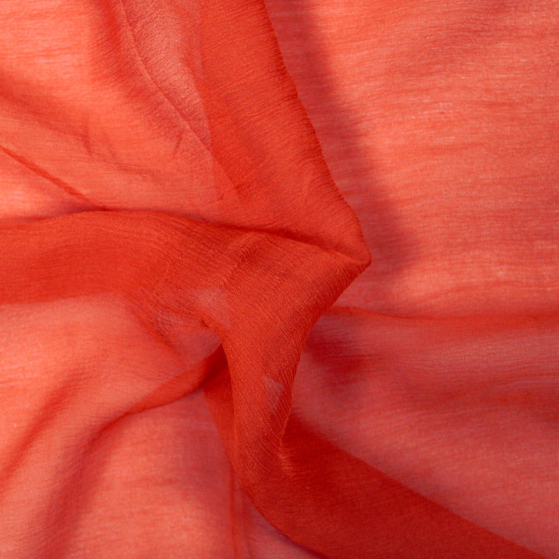 Smukt og florlet chiffonstof i 100% silke. Chiffon er glatvævet med luft mellem trådene, hvilket gør stoffet let og semi-transparent. Denne chiffon har desuden en crepeeffekt der giver stoffet en elegant og underspillet tekstur. Det er velegnet til f.eks. skørter og ærmer med vidde der benytter den smukke draperingsevne fuldt ud. Det bruges ofte til elegant festtøj og andre særlige lejligheder såvel som til smukke og behagelige natkjoler og bluser.
