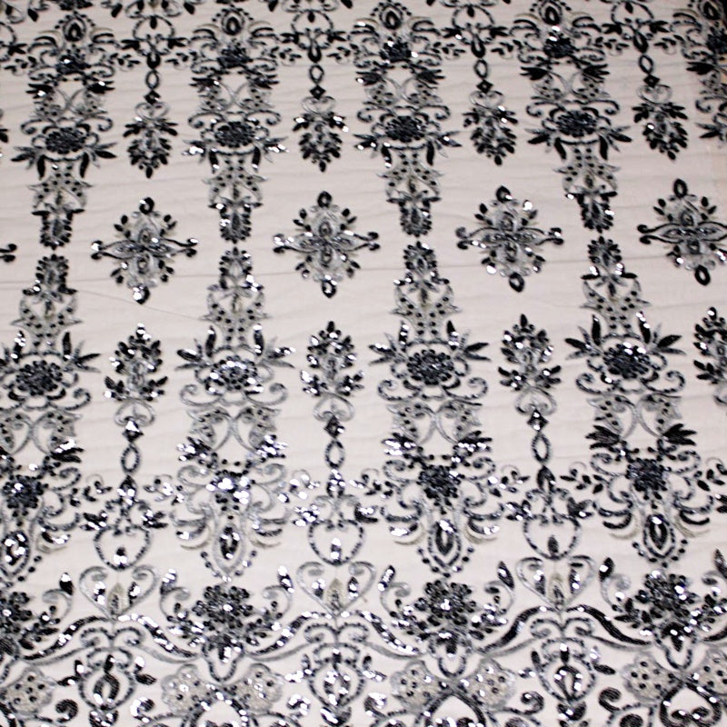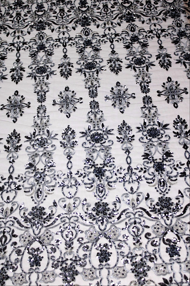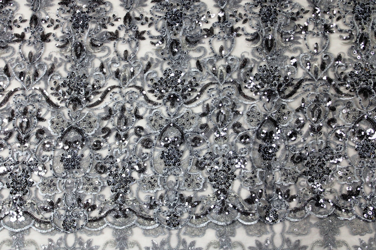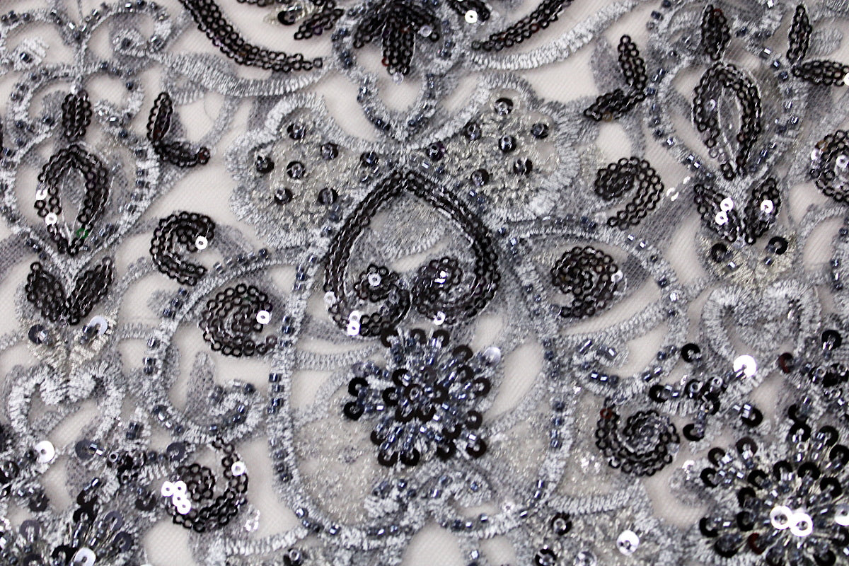 Der er brugt to slags runde pailletter med diameter på hhv. ca. 2mm og 4 mm. Derudover er der brugt små rørformede perler. Pailletter og perler er påsyet i mønster med blomstermotiver. Stoffets fulde bredde er 150 cm, og mønsterets bredde er 128 cm.