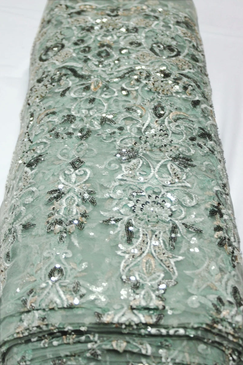 VINTAGE GRØNT TYL STOF MED PAILLETTER OG PERLER