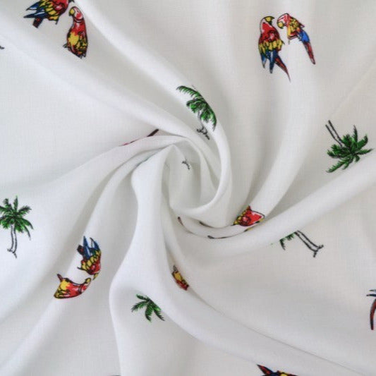 HVIDT VISKOSE STOF MED PAPEGØJE OG PALME PRINT – LET FALD & ELEGANT MAT GLANS