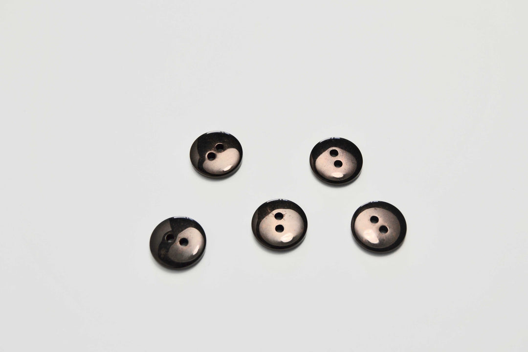 Sort 2-huls knap. Knapperne er lavet af plastik og har en diameter på ca. 14 mm.